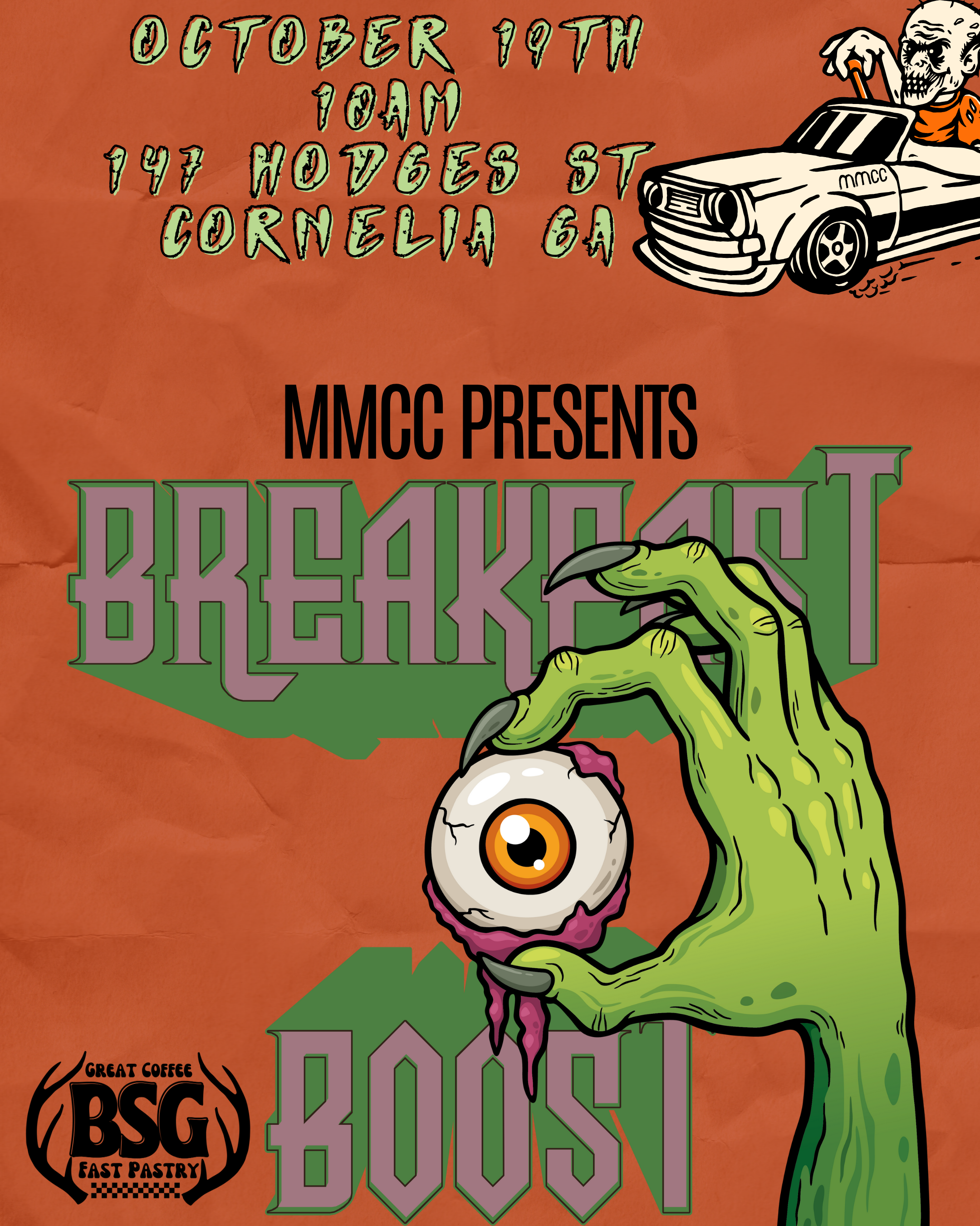 Back to All Events Breakfast & Boost Sunday, October 19, 2025 10:00 AM 1:00 PM BSG Coffee and Cafe 147 Hodges Street Cornelia, GA, 30531 United States (map) Google Calendar ICS All Makes, models and Monsters welcome for the spooky edition of Breakfast & Boost!Brought to you by the fast fellas at mountain Mixup Car Community. All cars must park in apple tree alley behind the cafe,See you there!